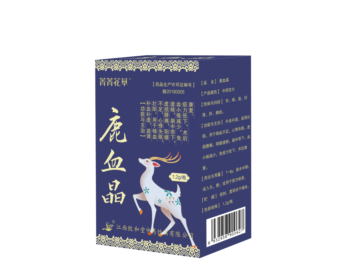 鹿血为鹿科动物梅花鹿和马鹿的血液,系名贵中药。自古以来就是宫廷皇族、达官显贵治病健身的珍品,以其为主的复方制品被称为仙家服食丹方。而今天的主角–中药直接口服饮片鹿血晶,就是采用先进的冷冻干燥技术,将鹿血在低温下快速冻结,然后在真空状态下进行升华干燥,以保留鹿血中的活性成分和原有结构,将干燥后的鹿血进行粉碎处理,得到细度均匀的鹿血晶粉末。鹿血晶呈不规则小薄片状,大小不等,紫红色或紫黑色,有角质样光泽,质坚脆,气微腥,味甘、微咸。